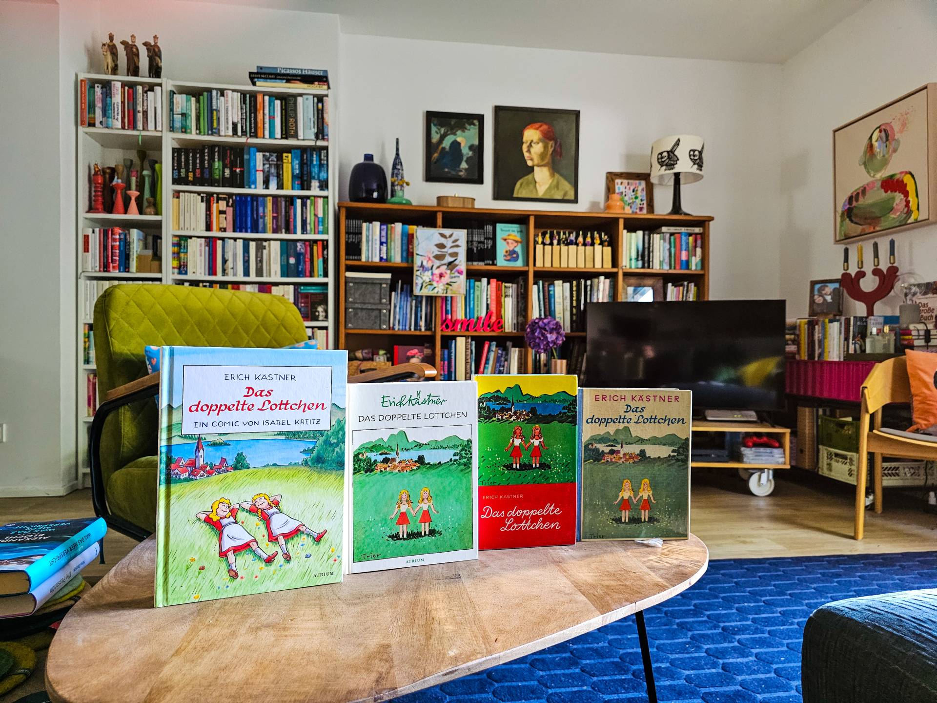 Als ich erwachsen wurde, habe ich mir dann endlich das so oft gelesene Buch antiquarisch gekauft. Ich nahm es mit nach Hause und es machte alles besser in meinem Bücherregal. Endlich stand da genau das Buch, das ich immer in meinem Beutel nach Hause getragen habe. Irgendwann entdeckte ich eine andere Ausgabe und stellte sie zur anderen ins Regal. Inzwischen arbeite ich für den Verlag, in dem Das doppelte Lottchen erscheint. So kamen zwei weitere Ausgaben zu mir.